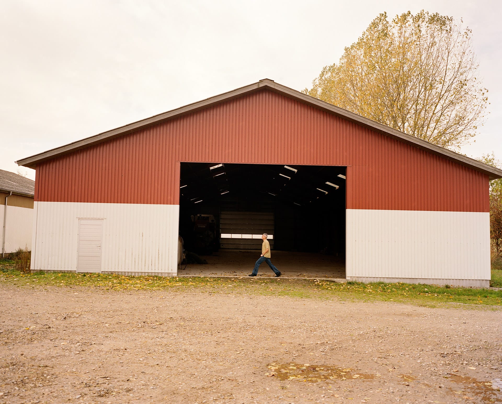 Once, this place was busy with cattle producing milk. Now it’s quiet. Five-hundred acres (200 hectares) of stubbly fields, a cluster of buildings – some still with cattle stalls and milking equipment – and a large concrete tank.
